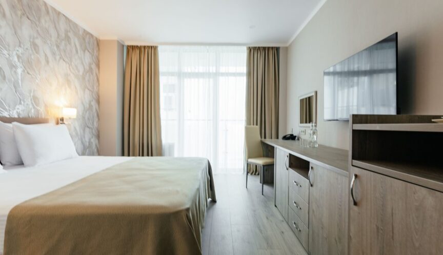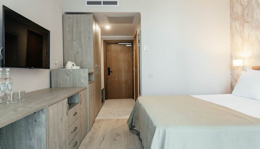 Стандартный однокомнатный номер площадью 15 кв. м. Номер оборудован односпальными кроватями или одной двуспальной кроватью. В номере есть прикроватные тумбочки, стол, стул, шкаф, вешалка и зеркало. Также установлены сейф, сплит-система, телевизор, телефон и холодильник. Имеется чайная станция. В номере есть балкон с мебелью. Санузел оснащён душем, предоставляются тапочки, туалетные принадлежности, фен и халат. Из номера открывается частичный вид на море (боковой).