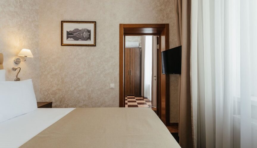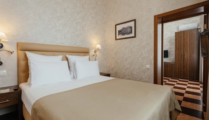 В номере есть мебель: вешалка, диван, зеркало, двуспальная кровать, прикроватные тумбочки, стол, стулья и шкаф. Из оборудования в номере предусмотрены сейф, сплит-система, телевизор, телефон, холодильник и чайная станция.