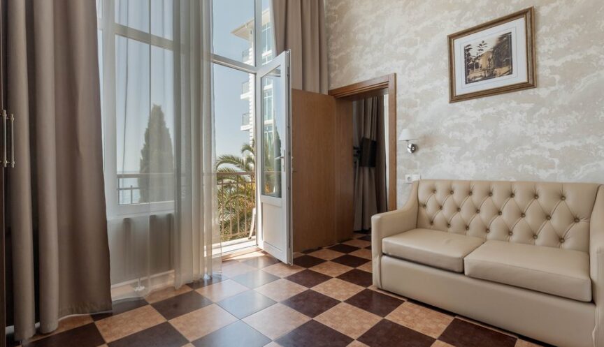Двухкомнатный номер «Джуниор Сюит» с видом на море расположен в корпусе №2. Номер оснащён французским балконом. В номере есть дополнительное место — диван. Площадь номера составляет 25 кв. м.