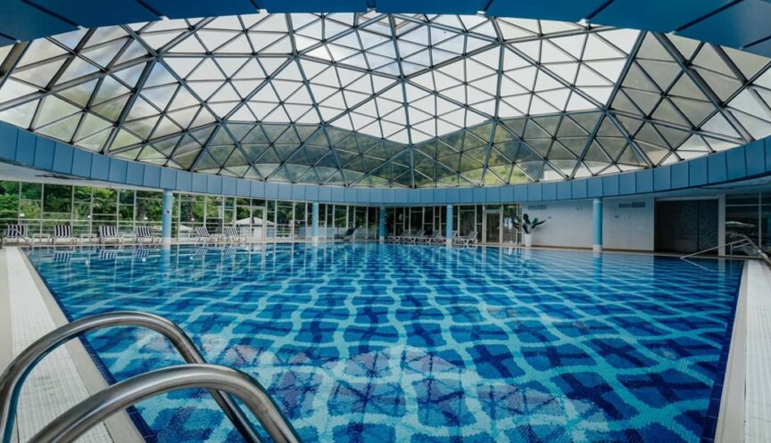 Крытый бассейн размером 17×17 м с глубиной от 1,2 до 2 м предлагает идеальные условия для плавания, тренировок и семейного отдыха. Вода пресная, санитарные нормы соблюдаются, а пользование бассейном входит в стоимость услуг.